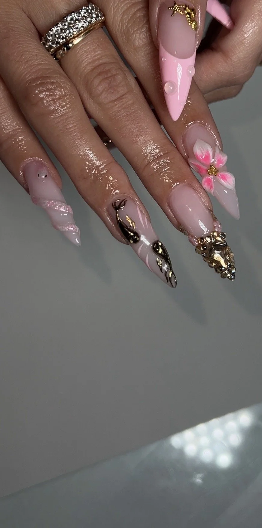 Complex, sculpted 3D, intricate line work, 3 or more charms, up to 5 designs.